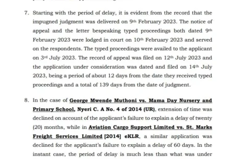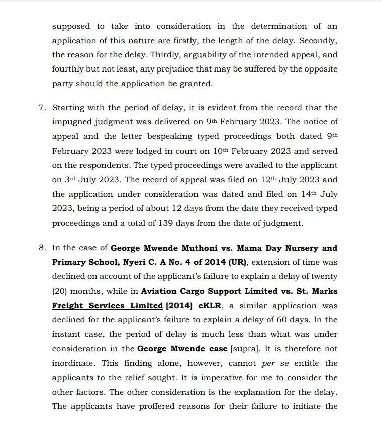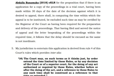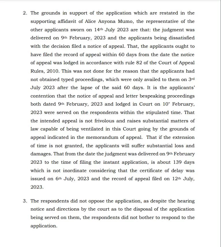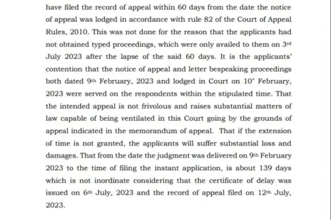 “The judgment was issued on February 9, 2023, and the dissatisfied applicants filed a notice of appeal. According to Rule 82 of the Court of Appeal Rules, 2010, the applicants were required to submit the record of appeal within 60 days from the date of filing the notice of appeal. This deadline was not met due to the unavailability of typed proceedings, which were only provided on July 3, 2023, after the 60-day period had lapsed,” reads a part of the ruling.