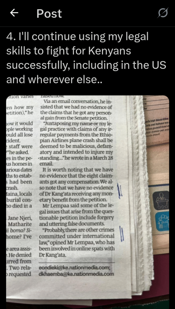 Kang’ata has come out to deny all these claims, calling the NTV report false and politically motivated. He insists that all the real families he represented were paid and that none of the eight individuals mentioned in the exposé received money.