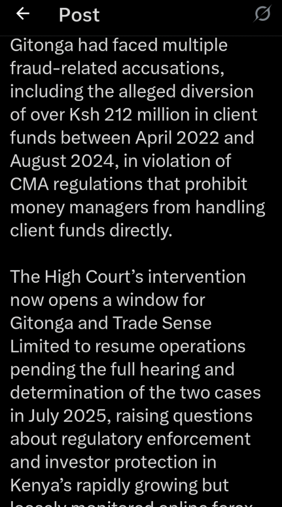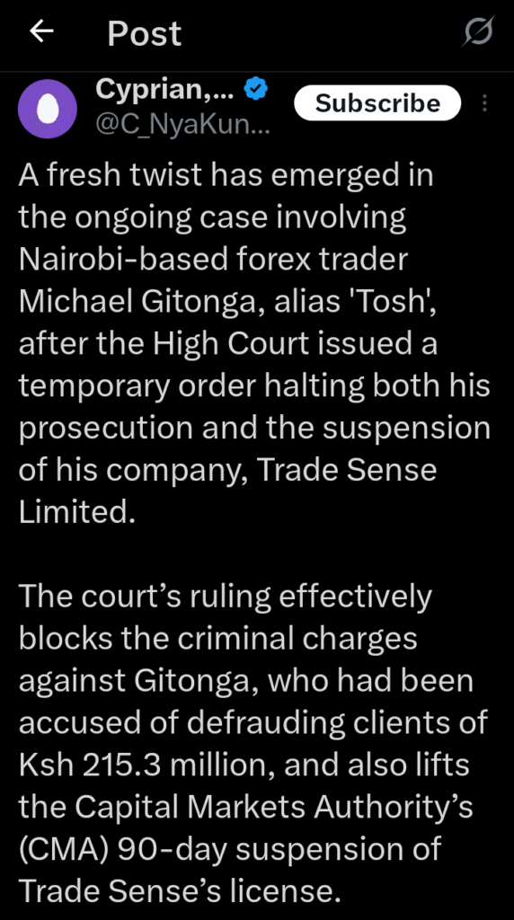 This decision has brought new attention to the case, which had already attracted public interest due to the large sums of money involved and the growing concerns over online forex trading in Kenya. The court’s ruling now blocks the criminal charges that had been filed against Gitonga. He had been accused of defrauding his clients of Ksh 215.3 million, a serious claim that had also led to the suspension of Trade Sense Limited by the Capital Markets Authority (CMA).