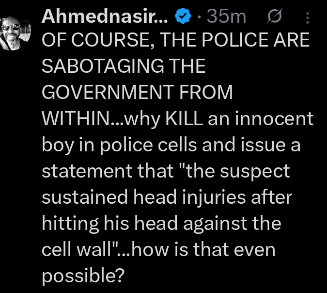 In a tweet shared on Sunday, Ahmednasir directly blamed the police, saying they are now sabotaging the same government they are meant to serve. He questioned how a healthy young man could end up dead inside a police station with the explanation being that he hit his own head on the wall.