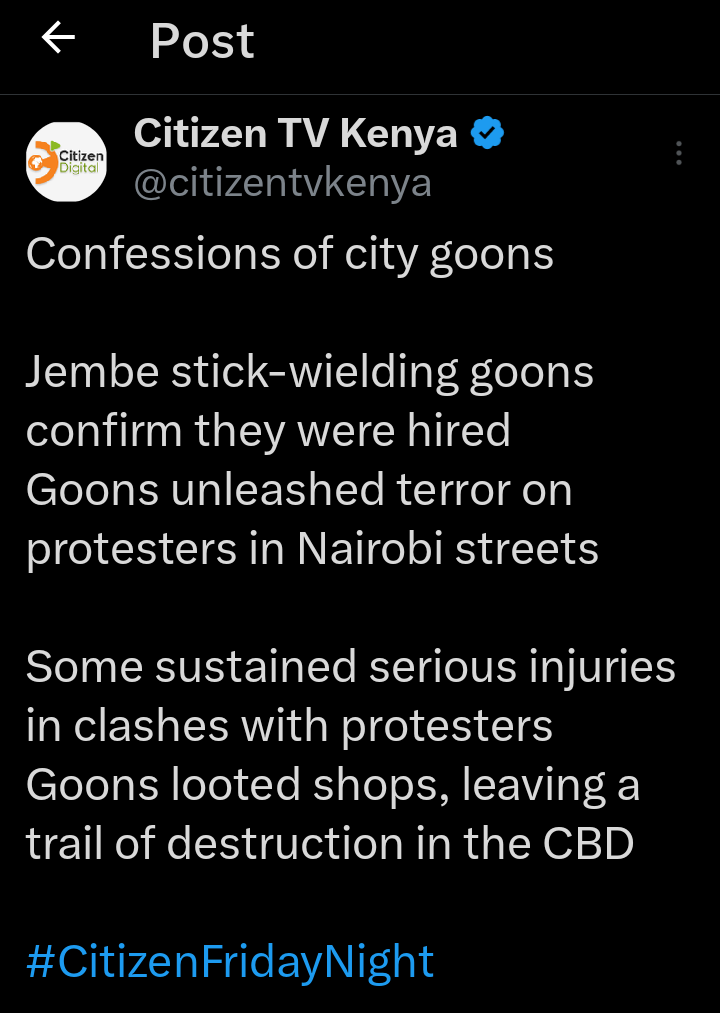 Citizen TV revealed shocking details. According to one of the hired goons, they were brought together, promised decent pay, but ended up being given only Kshs 50 each to cause chaos.