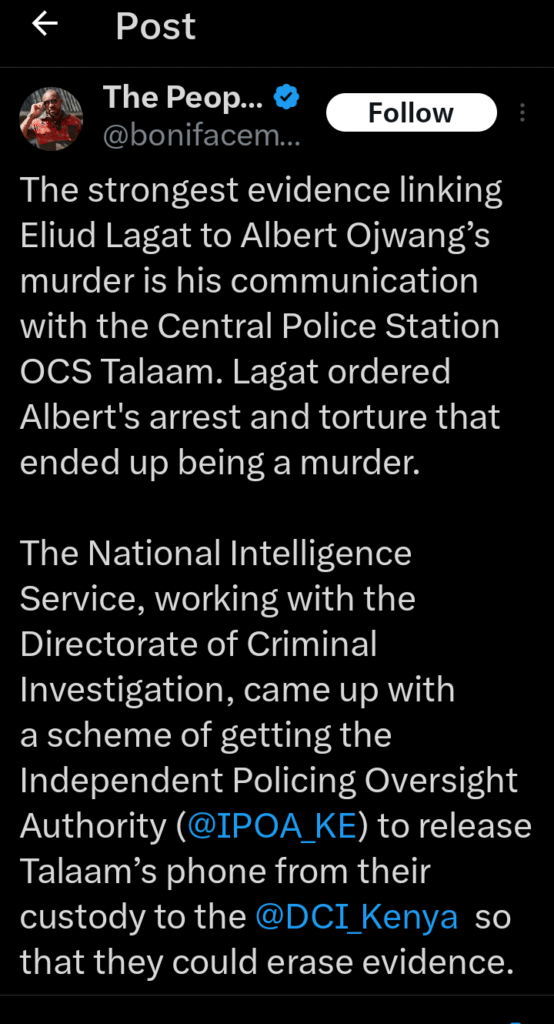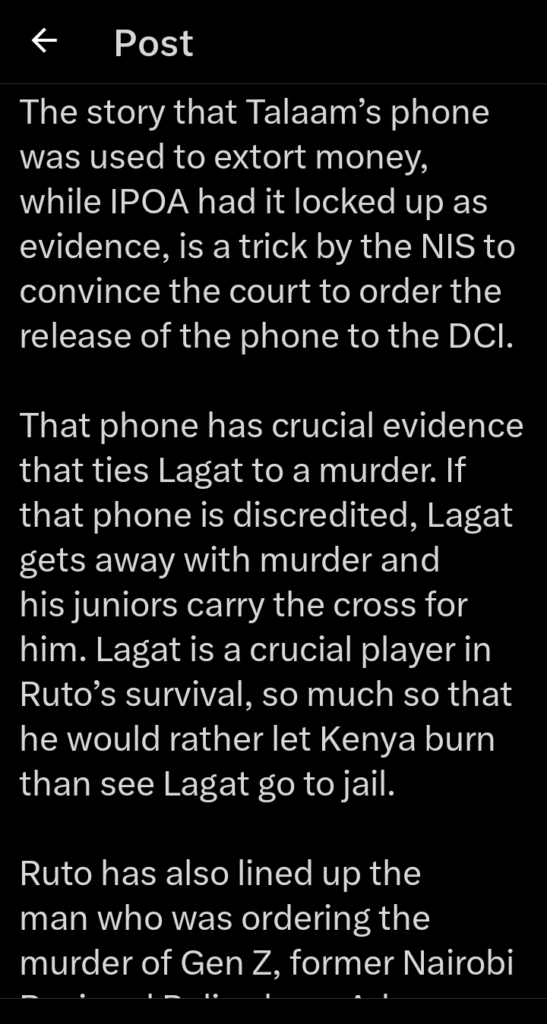 That phone is believed to hold strong proof of the communication between Lagat and Talaam before and after the murder of Albert Ojwang. If that data is wiped out, there will be no direct evidence linking Lagat to the murder.