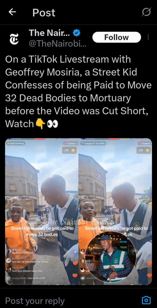 He claimed he personally helped carry 32 dead bodies to the City Mortuary and that they were paid and warned not to speak about it. As soon as those words were said, the Livestream started gaining huge attention, with thousands of Kenyans joining in to watch and comment in real-time.