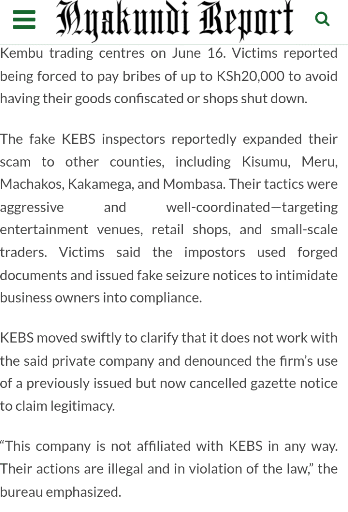Why wasn’t the public warned earlier about this cancelled notice? KEBS only issued a public statement on July 1, long after the fake inspectors had terrorised traders in Longisa, Merigi, Kembu, and many other places.