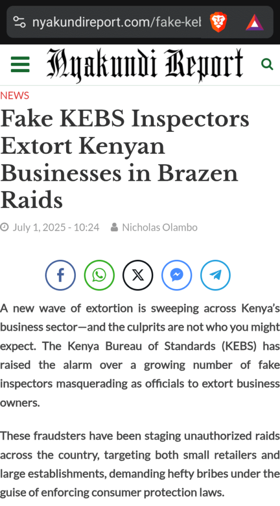 From Bomet to Mombasa, the pattern is the same men dressed in what looks like KEBS uniforms, arriving in branded vehicles, threatening shop owners, and collecting bribes of up to KSh20,000.