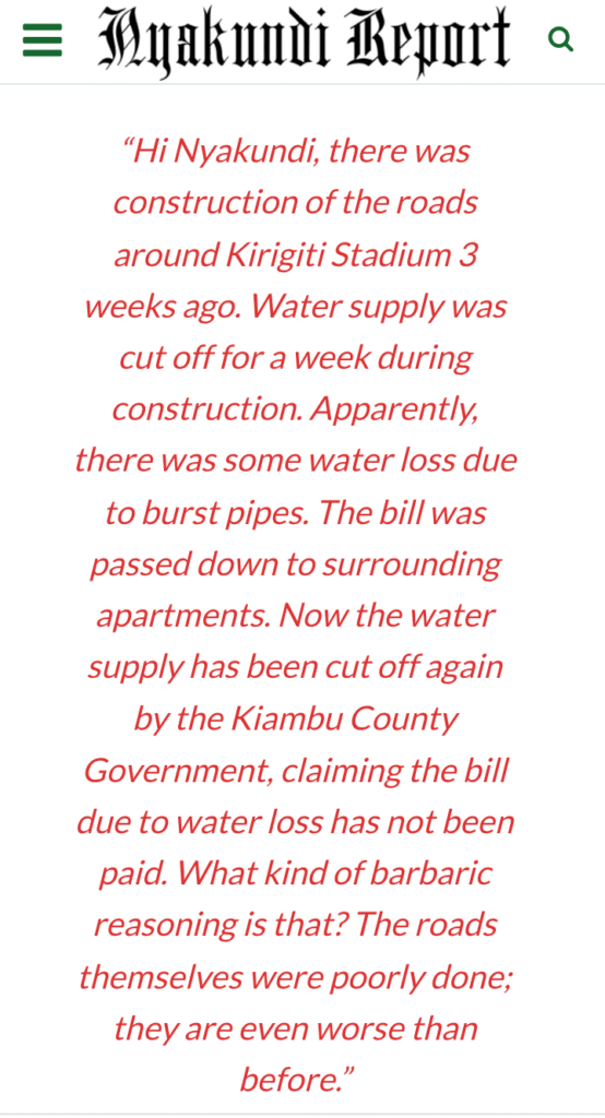 During the works, water pipes were reportedly damaged, resulting in a week-long water outage for nearby estates and apartments.Instead of fixing the problem and restoring water access, the county government allegedly turned against the very people affected.