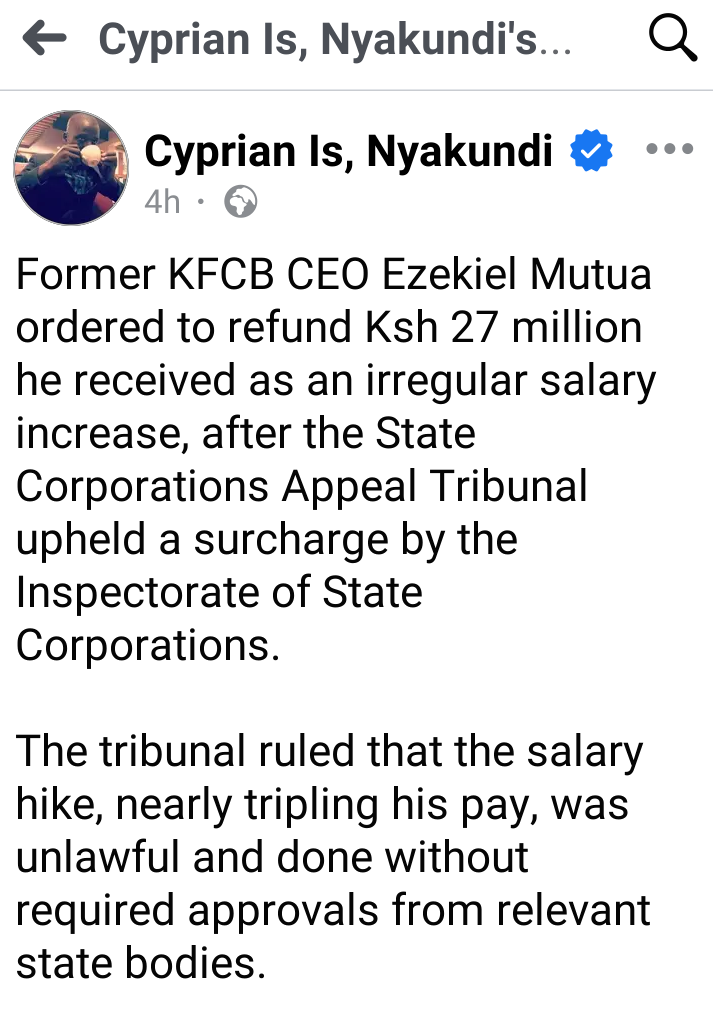 Ezekiel Mutua, the former CEO of the Kenya Film Classification Board (KFCB), has been exposed for pocketing millions of taxpayers’ money through an illegal salary increment.