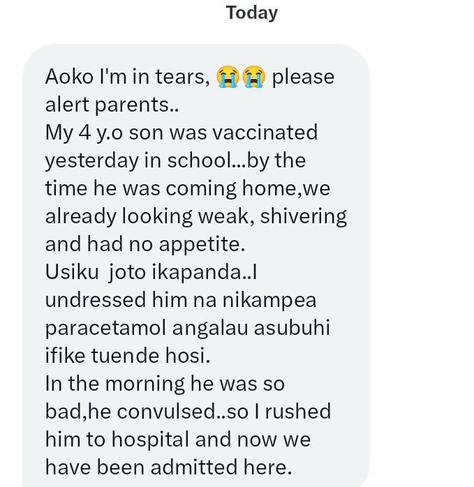 A disturbing case has caught the attention of many Kenyans after a parent shared on social media that her 4-year-old son had a serious reaction to a vaccine given at school without her consent.