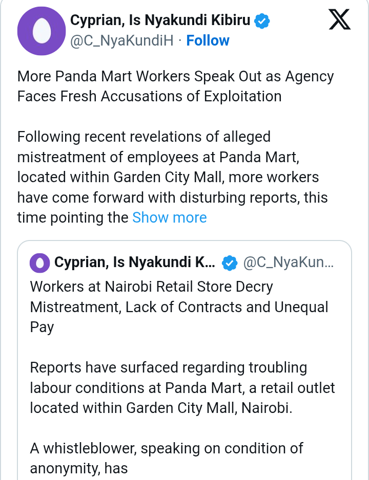 Fresh claims of serious misconduct have emerged from Panda Mart, adding to the growing controversy surrounding the Chinese-owned retail chain that runs outlets in various parts of Nairobi, including Garden City Mall and Galleria Mall on Lang’ata Road.