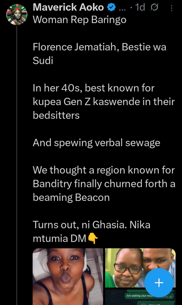Through her posts on X, Aoko accused Jematiah of engaging in behavior that she described as shameful and unfit for someone in public office.