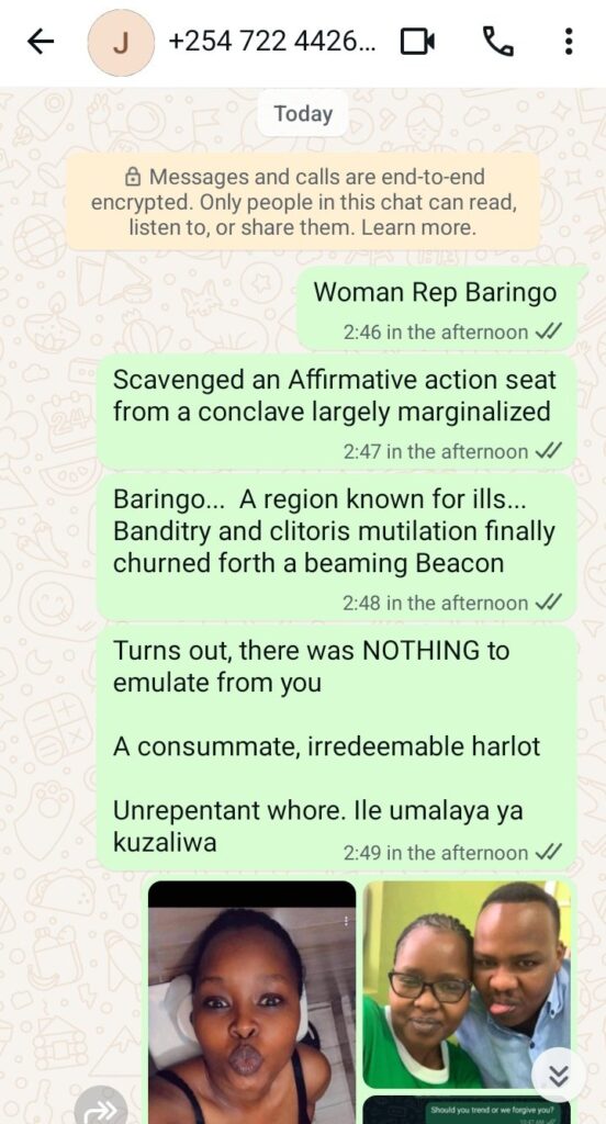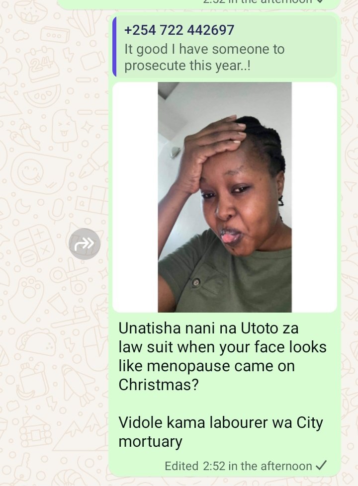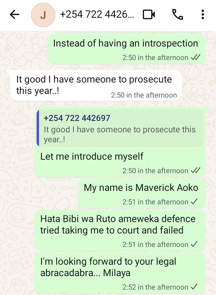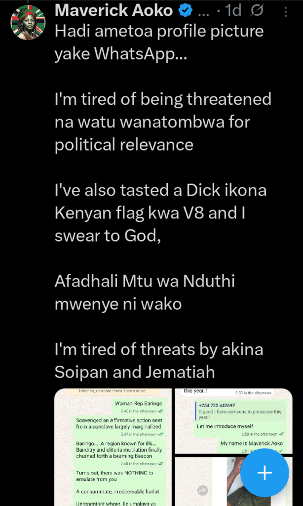 Aoko supported her claims with screenshots of WhatsApp messages, some of which contained harsh threats, including statements such as “Do it and I will make sure you will die this government is mine” and “6 ft down and I will cement it myself.”