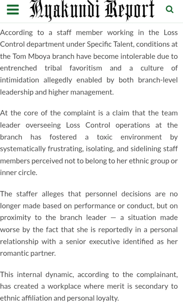 According to a message shared by Cyprian Is Nyakundi, a staff member working in the Loss Control department has described the working environment as unbearable, with claims of tribalism, intimidation, and favouritism dominating the branch.