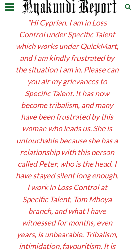 Other supermarkets, like Magunas, have also been exposed for tribalism, unfair deductions, and harsh treatment of workers. What makes this case more serious is that it also questions the role of staffing agencies like Specific Talent.