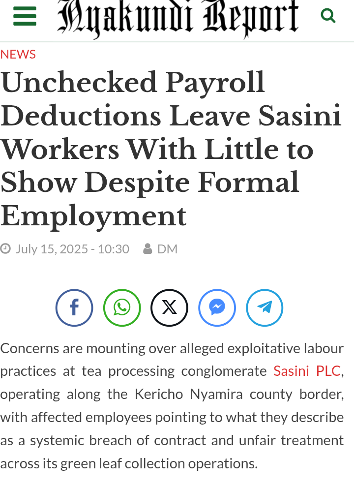 Concerns are growing around the way Sasini PLC, a tea company operating along the border of Kericho and Nyamira counties, treats its employees.