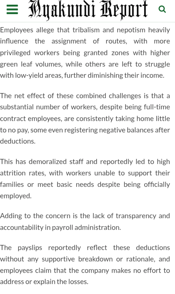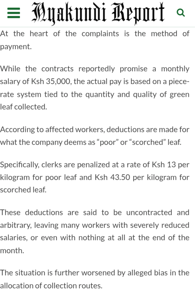 According to testimonies shared with Cyprian Is Nyakundi, employees at Sasini’s Kipkebe and Keritor estates and factories were promised a monthly salary of Ksh 35,000 in their contracts. However, instead of being paid that amount, their pay depends on how much green leaf they collect and whether the company approves the quality. When the company decides that the leaf is “poor” or “scorched,” deductions are made.