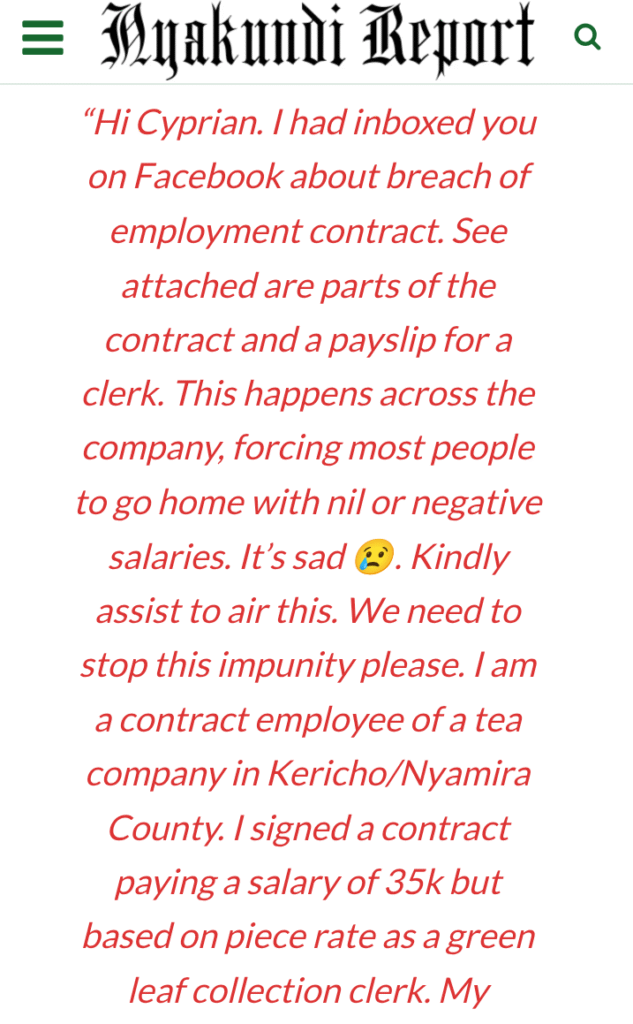 One clerk, in a message sent to Cyprian Is Nyakundi, wrote, “Hi Cyprian. I had inboxed you on Facebook about breach of employment contract. See attached are parts of the contract and a payslip for a clerk. This happens across the company, forcing most people to go home with nil or negative salaries. It’s sad. Kindly assist to air this. We need to stop this impunity please.”