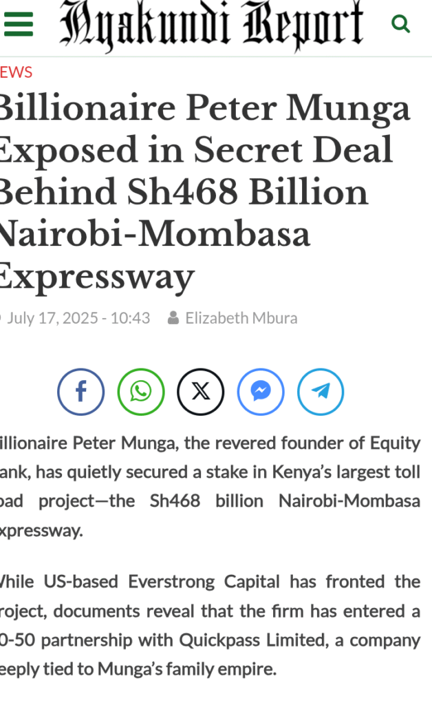 Peter Munga has a long history of profiting from strategic positions, from selling off shares in Britam to building massive wealth through Equity Bank. Now, by linking his family to a 30-year tolling business on a key transport corridor, he stands to secure yet another windfall.