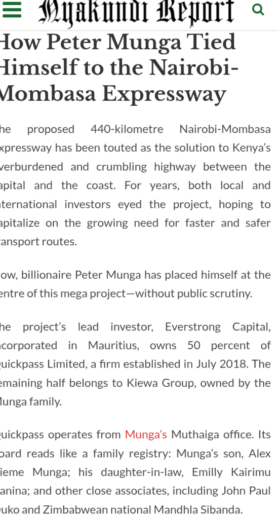 According to an exposé by Cyprian Is Nyakundi, Quickpass Limited is more than just a silent partner. It operates from Munga’s Muthaiga office, and its directors include Munga’s own son and daughter-in-law.