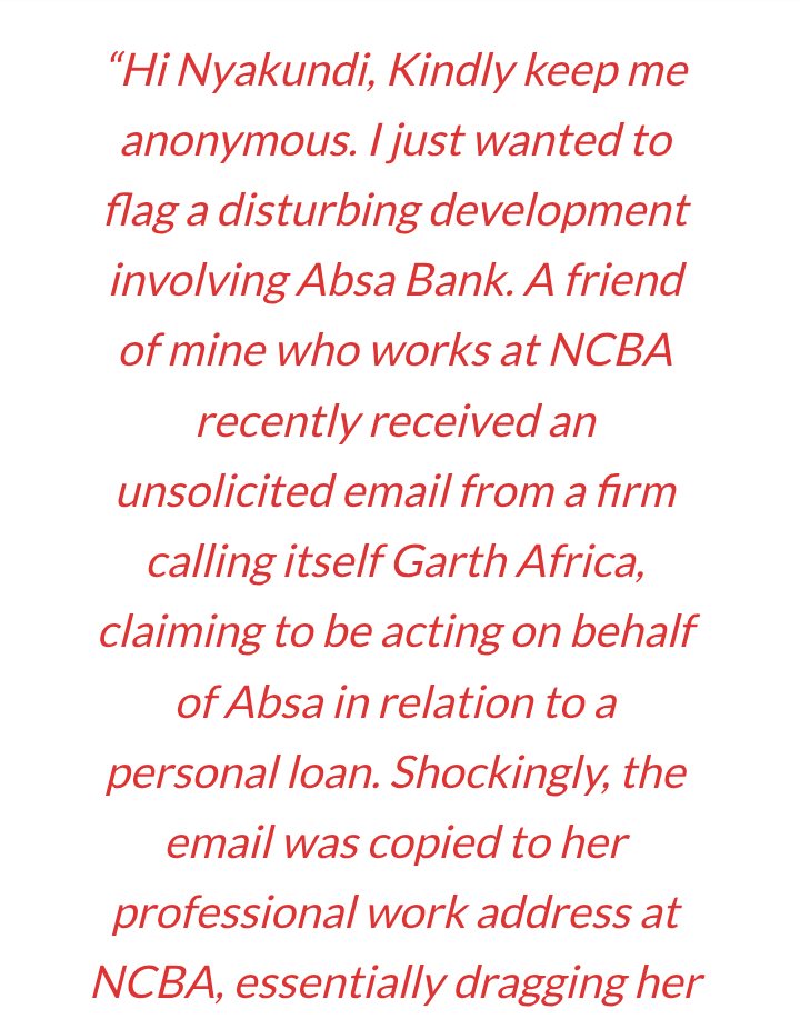 Through a source who reached out to him anonymously, Nyakundi shared how a staff member at NCBA Bank received an unsolicited email from a firm called Garth Africa, which claimed to be working on behalf of Absa.