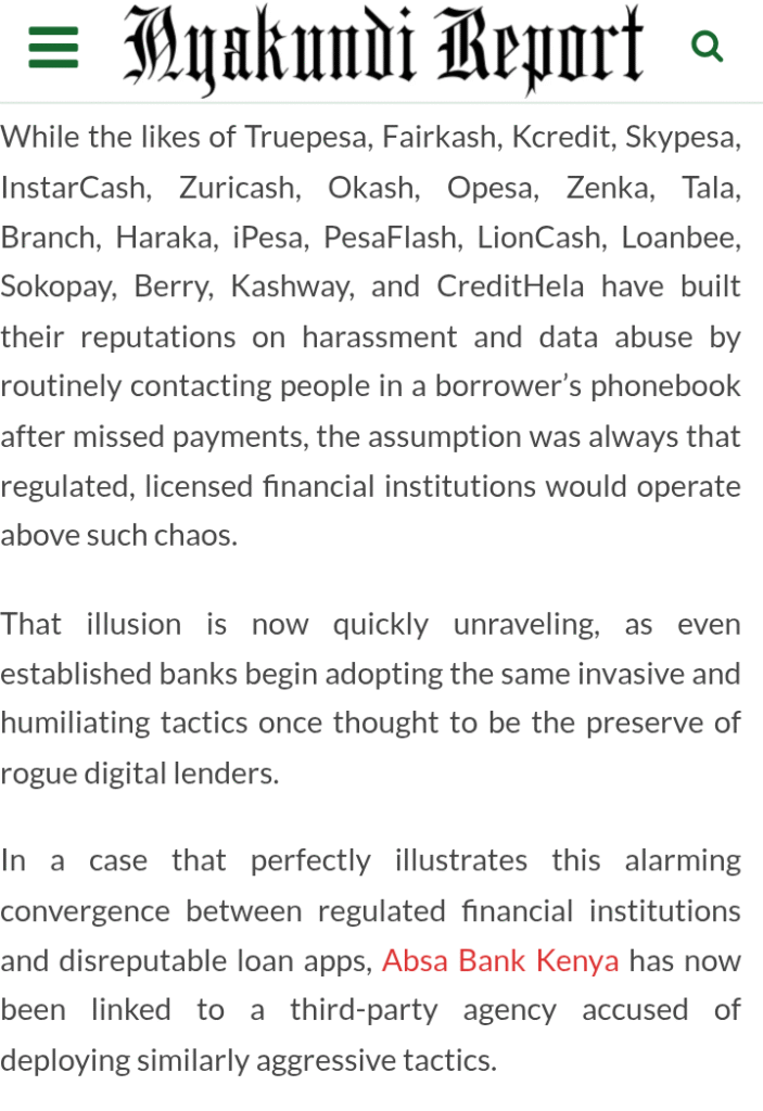 Kenya’s financial sector is now facing new concerns as even licensed banks begin using tactics that were once associated only with rogue digital lenders. Cyprian Is Nyakundi, a consistent critic of privacy violations in the lending industry, has exposed a disturbing case involving Absa Bank Kenya.