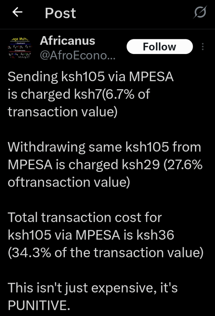This means that out of Ksh105, Ksh36 is spent just on fees. That’s more than a third of the total amount, which makes it very expensive for those who don’t earn much. People are saying that these charges are too high and feel like a punishment.