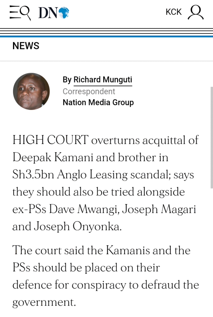 The High Court has ruled that Deepak Kamani, Rashmi Kamani, and former Permanent Secretaries Dave Mwangi, Joseph Magari, and Joseph Onyonka must now defend themselves in court over their role in the Sh3.5 billion Anglo Leasing scandal.