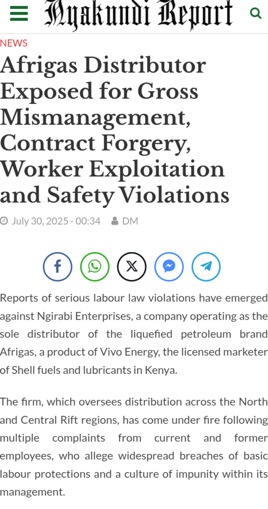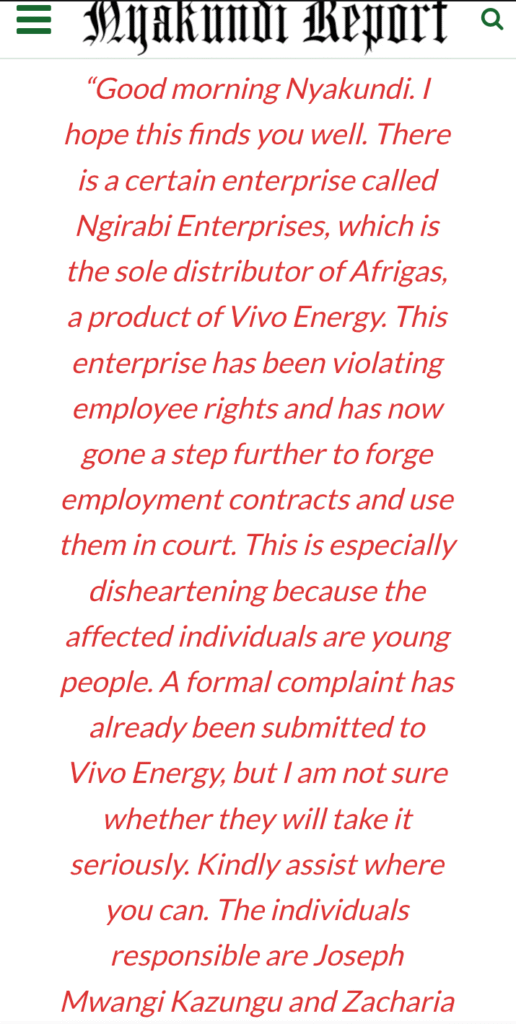 โGood morning Nyakundi. I hope this finds you well. There is a certain enterprise called Ngirabi Enterprises, which is the sole distributor of Afrigas, a product of Vivo Energy. This enterprise has been violating employee rights and has now gone a step further to forge employment contracts and use them in court. This is especially disheartening because the affected individuals are young people. A formal complaint has already been submitted to Vivo Energy, but I am not sure whether they will take it seriously. Kindly assist where you can. The individuals responsible are Joseph Mwangi Kazungu and Zacharia Mwangi.โ