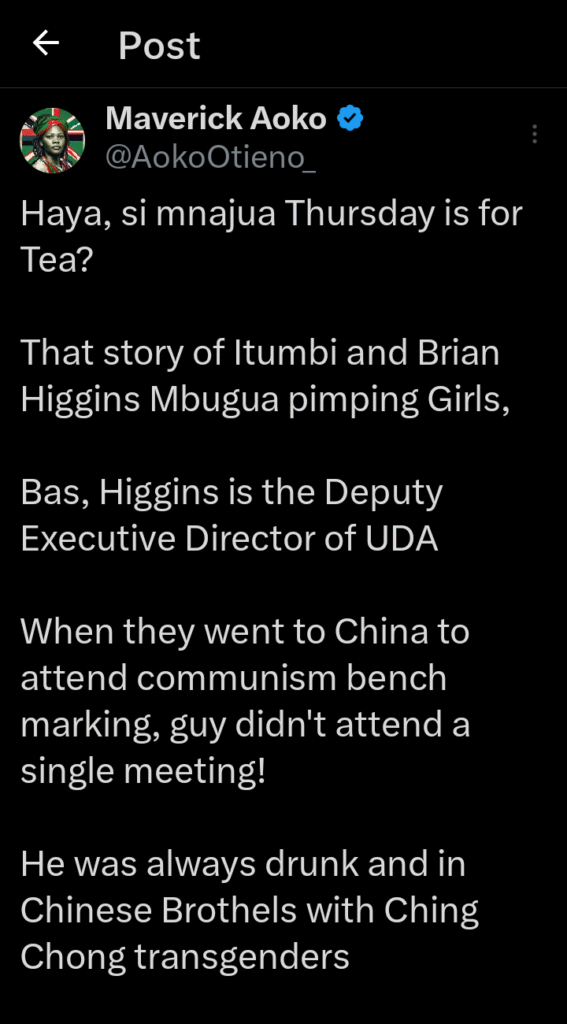 On July 31, 2025, Maverick Aoko shared a detailed post on X accusing Brian Higgins Mbugua, the Deputy Executive Director of UDA, of shameful conduct during an official party trip to China.