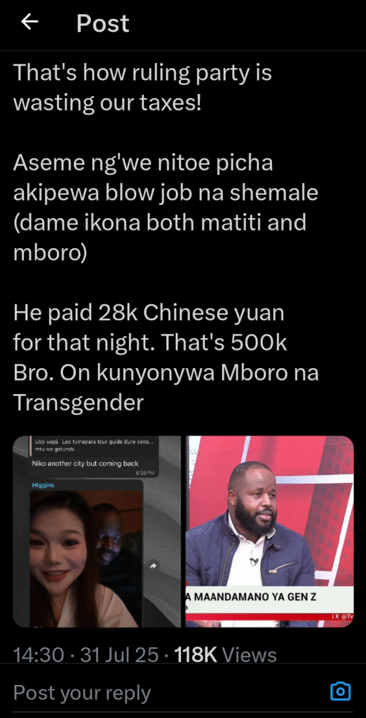 She claimed that he paid 28,000 Chinese yuan, nearly half a million Kenyan shillings, for services from transgender sex workers. Although the post it has triggered serious questions about Mbugua’s character and how taxpayers’ money is being used during such trips.
