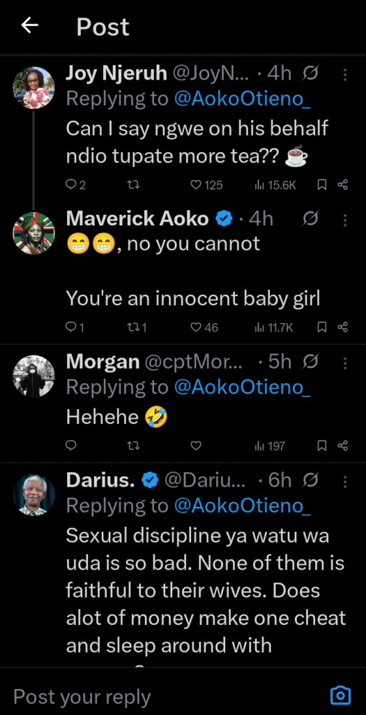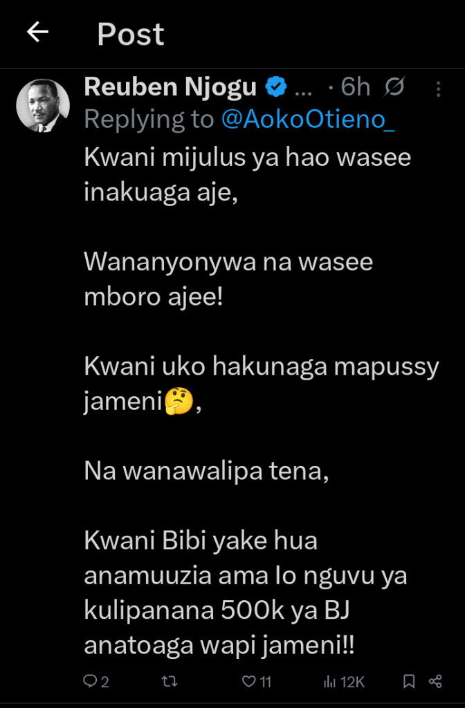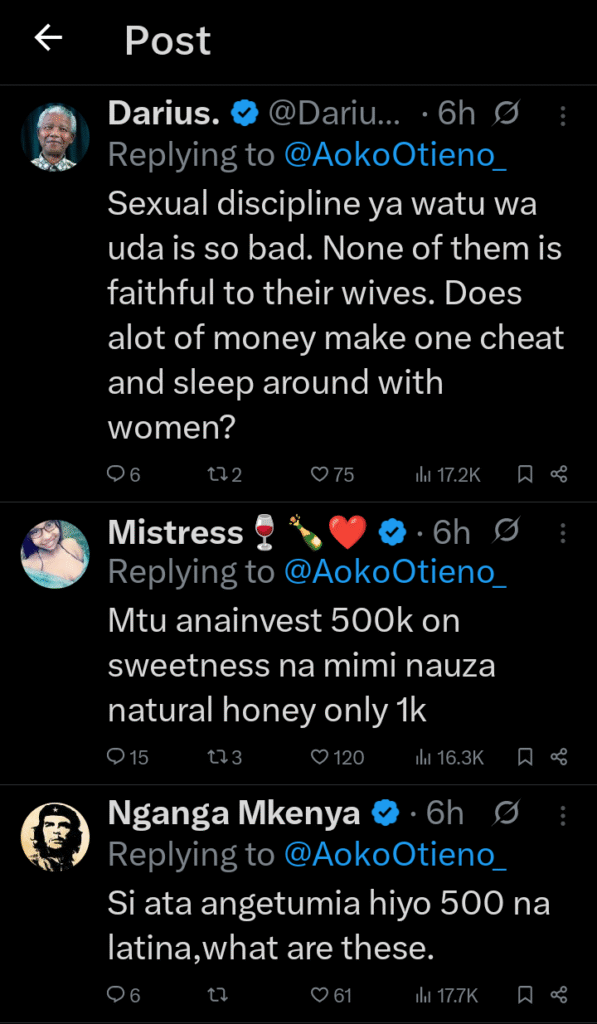 Even though Aoko is known for her aggressive and unfiltered style, her posts often force uncomfortable truths into public view, and this one has kept Mbugua’s name in public conversation.