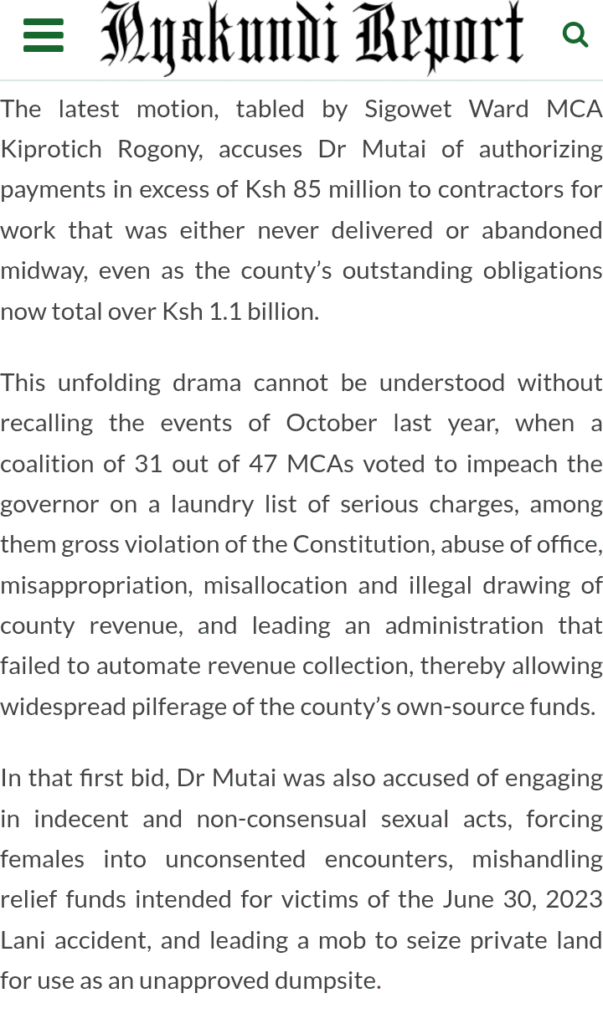 At the time, 31 out of 47 MCAs supported a motion to impeach the governor, accusing him of several serious violations. These included misuse of public funds, abuse of office, illegal handling of county revenue, and failure to automate the revenue collection system, which led to widespread corruption.