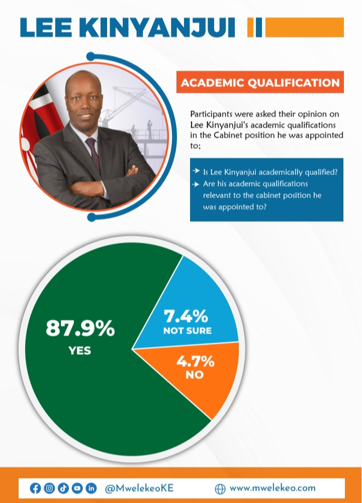 Respondents were asked if Lee Kinyanjui, the Cabinet Secretary for Trade and Industrialization, was academically qualified for the position. A large majority, 87.9%, said Yes, while 4.7% felt he was not qualified. The rest were either unsure or did not respond.
