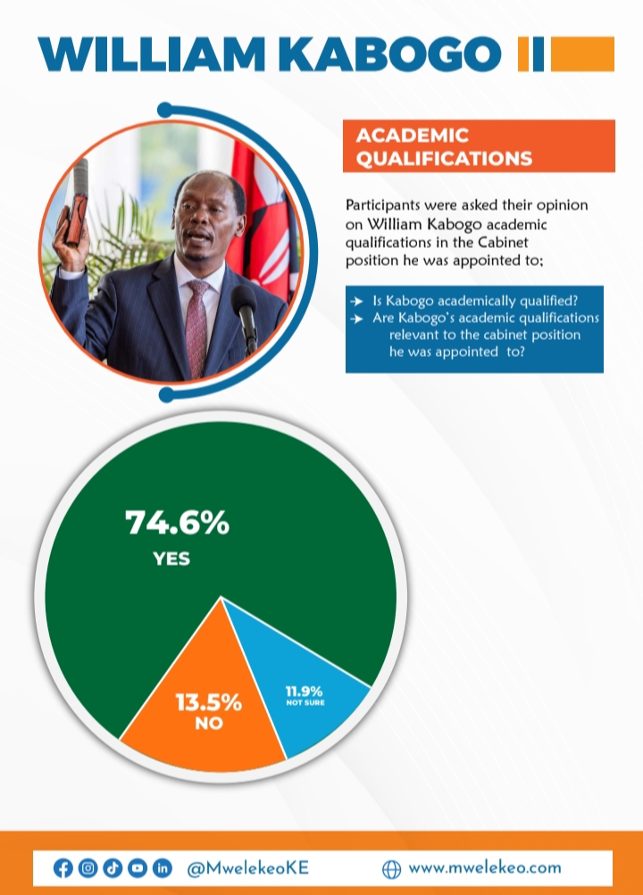 The poll also assessed William Kabogo, appointed as the Cabinet Secretary for Information, Communication, and Technology (ICT).