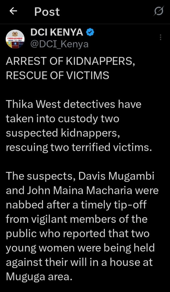 Members of the public in Thika West played a key role in helping detectives rescue two young women who had been kidnapped and held in a house in the Muguga area.