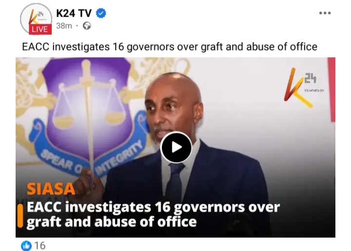 The Ethics and Anti-Corruption Commission has opened investigations into 16 county governors over claims of corruption and misuse of office. Out of the group, five are current governors while the rest are former county chiefs.