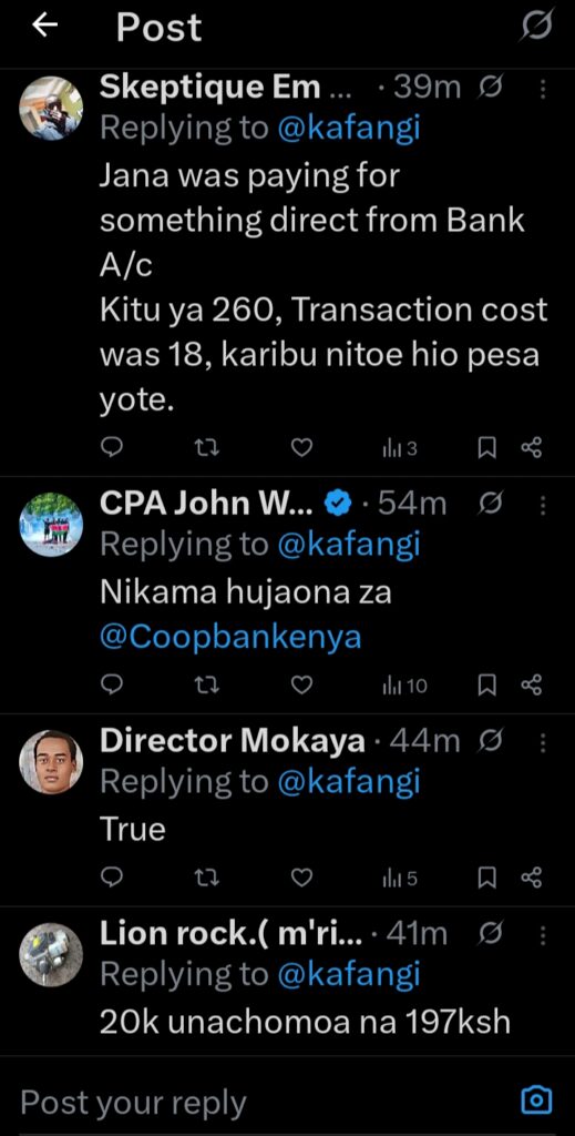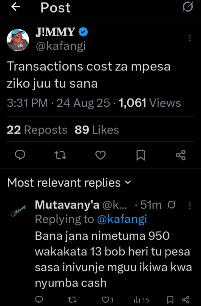 Ordinary citizens express this frustration daily, with one simple statement capturing the mood on the ground: “Transactions cost za mpesa ziko juu tu sana.”