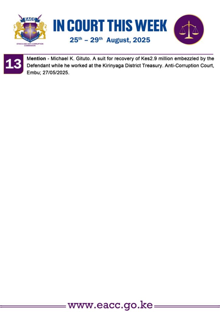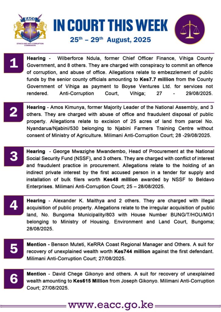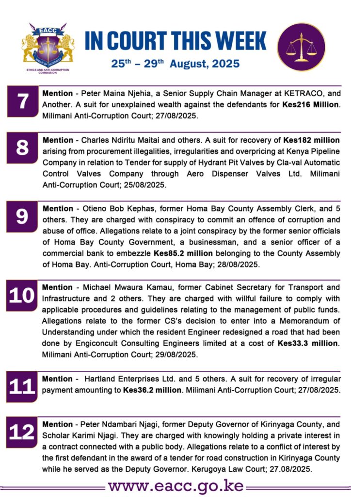 Former pipeline officials faced charges over a fraudulent tender for hydrant pit valves, which led to losses and substandard supplies. In Homa Bay, a county assembly clerk and associates were convicted for embezzling 85 million shillings through money laundering and fake contracts, while in Kirinyaga, a former deputy governor was charged with conflict of interest in a road tender awarded to an associate.