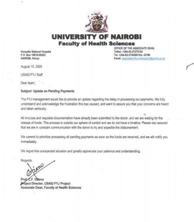 Complaints first emerged in May 2025, but as of August 2025, the issue remains unresolved. The University of Nairobi, which oversees the project, confirmed that all necessary invoices and supporting documentation had been submitted to the donor, but the funds have not yet been released.