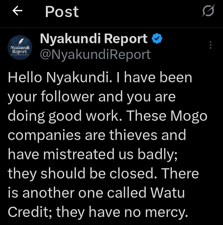 In a message shared with blogger Cyprian Nyakundi, one frustrated borrower described just how bad things have become. The person wrote, “Hello Nyakundi. I have been your follower and you are doing good work. These Mogo companies are thieves and have mistreated us badly; they should be closed. There is another one called Watu Credit, they have no mercy. Imagine you pay Ksh 40,000 and for that motorcycle you will pay Ksh 250,000, and if you buy the bike in cash it is Ksh 150,000. When you try to finish paying you are either cheated or threatened, and when their bikes go missing you cannot recover them even if tracked. They claim they cannot locate the thieves. Please, please help these motorcycle owners.”