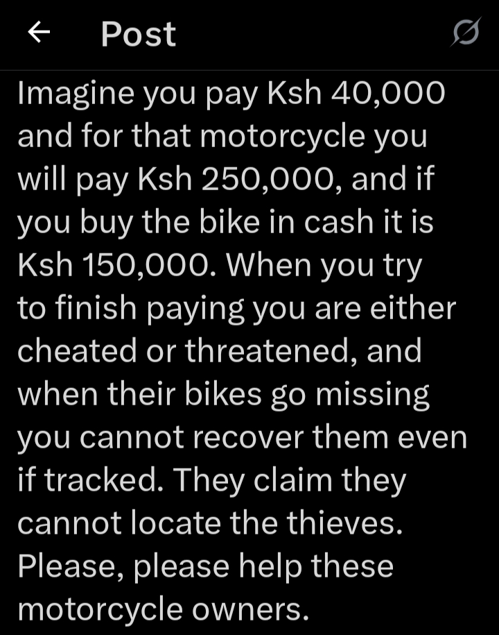 A motorcycle that costs Ksh 150,000 in cash ends up costing around Ksh 250,000 or even more when financed through these lenders. The high interest rates and unexplained fees make repayment almost impossible.