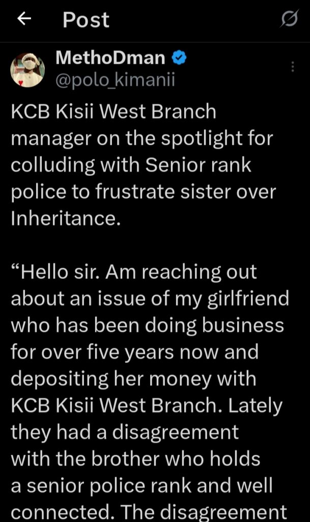 The Kenya Commercial Bank (KCB) Kisii West Branch is facing mounting scrutiny following disturbing allegations that its branch manager colluded with a senior-ranking police officer to unlawfully deny a woman access to her own bank account.