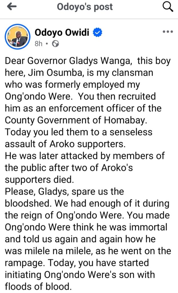 This is the type of situation Homabay residents thought they had left behind. Owidi reminds Governor Wanga that they endured enough turmoil during Ong’ondo Were’s era.