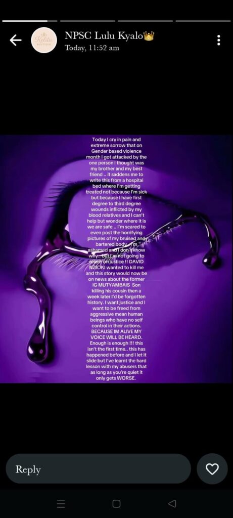From her hospital bed, she wrote that she was in pain and filled with sorrow. She said the attack happened during Gender-Based Violence Month, which made the experience even more heartbreaking for her.