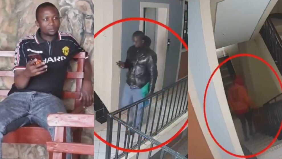 A man is seen leaving a room using the staircase while carrying the same blue bag Otieno had brought in. Soon after, another person rushes down the staircase, followed by a third man who appears half-naked and in a panic, clutching a package as he moves quickly out of sight.