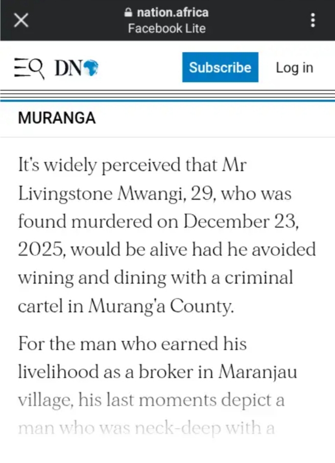 Shock and grief have spread through a village in Murang’a County following the death of Livingstone Mwangi, a man in his thirties whose life was cut short under unclear and troubling circumstances. Mwangi’s family says he left home on the night of December 22, 2025, to spend time with friends and did not return.