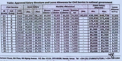 Under the new pay structure, higher-grade officers such as those in CSG4 will earn a basic salary ranging from Ksh 185,690 to Ksh 396,130.