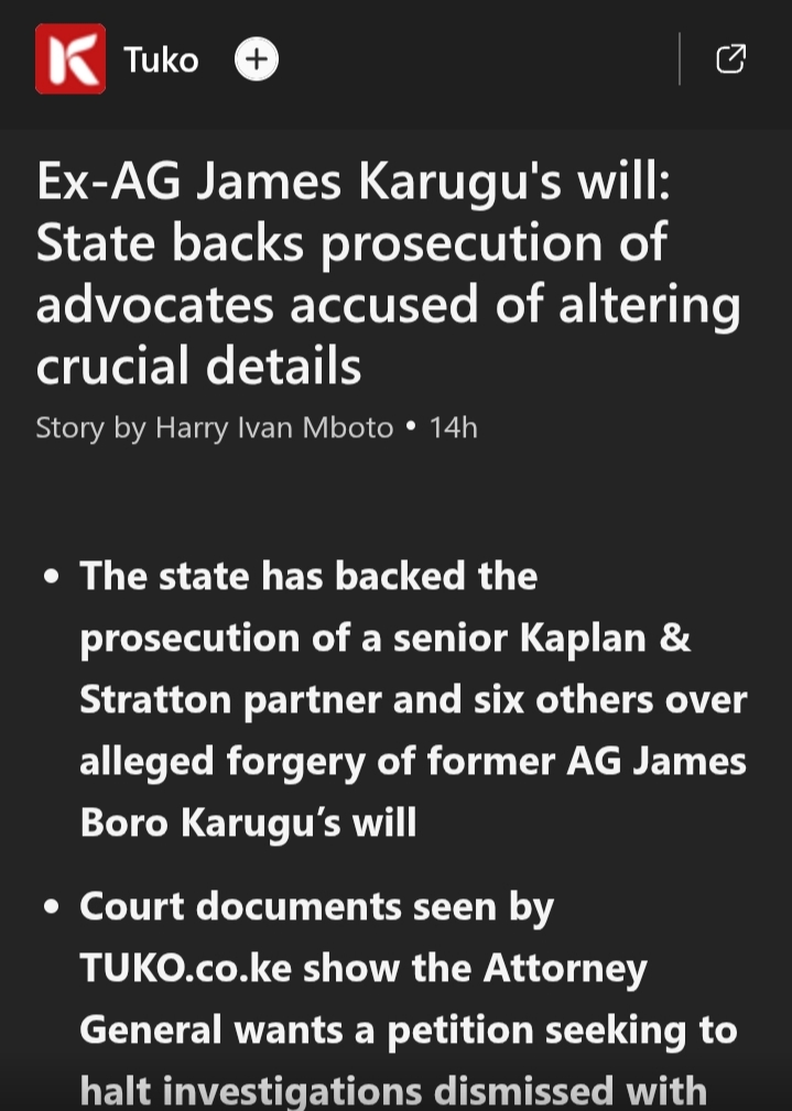 The controversy largely centers on an alleged forged will belonging to the late former Attorney General James Karugu.