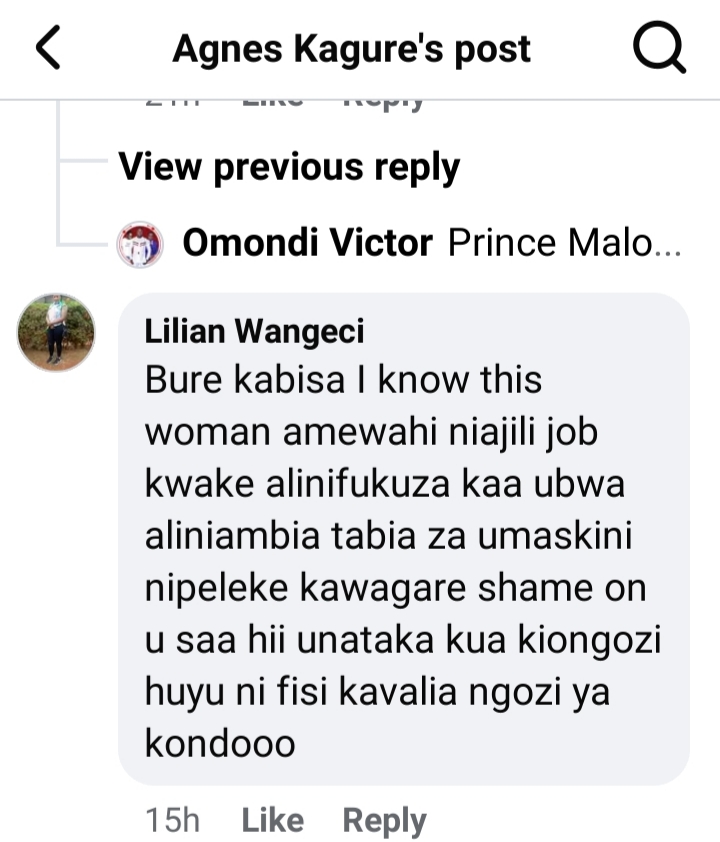 Her comment directly challenged the image Kagure was projecting in her message. Instead of reacting to the motivation in the post, Wangeci shared what she claimed was a personal experience with Kagure.In her words, Wangeci wrote: “Bure kabisa I know this woman amewahi niajili job kwake alinifukuza kaa ubwa alinambia tabia za umaskini nipeleke kawagare shame on u saa hii unataka kua kiongozi huyu ni fisi kavalia ngozi ya kondooo.”